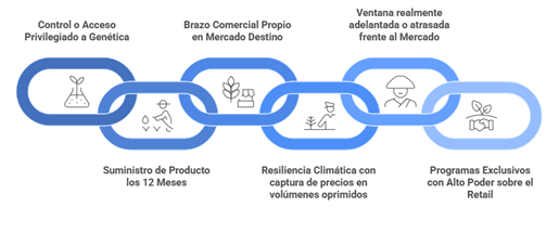 La variedad determina el perfil organoléptico, la ventana de cosecha y el precio FOB potencial. Las empresas que cuentan con genética propia (p.e. Hortifrut, Camposol) pueden destacar del resto que son tomadores de genética. Más atrás se encuentran las empresas que tienen acuerdos exclusivos o alianzas con casas genéticas, e incluso luego los que tienen el acceso temprano a testear variedades que permiten aprender anticipadamente el manejo, construir volumen, y cuando el mercado llega masivamente a esa variedad, ser un proveedor de referencia.