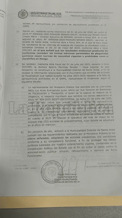 En esa línea, el alcalde de Santa Anita confirmó que el municipio recibió la disposición fiscal para actuar según sus competencias, ante la persistencia de dicho producto en alimentos del mercado. De seis muestras tomadas por la Fiscalía, cuatro presentaron residuos de pesticidas no aptos para el consumo humano.