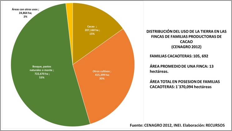 Según el Cenagro 2012, teníamos 105.592 fincas cacaoteras que ocupaban alrededor de 1.4 millones de hectáreas en total. Cada finca tenía un promedio de 13 hectáreas, de las cuales 2 hectáreas estaban sembradas con cacao, 3.9 hectáreas con otros cultivos y 6.8 hectáreas eran bosque, pastos naturales y montes. Multiplicando estos promedios por el número de fincas tenemos que existen unas 207.000 hectáreas con cacao, unas 415.000 hectáreas con otros cultivos y 722.000 hectáreas de bosque, esas cifras representan el 15%, 24% y 52% de las áreas totales ocupadas por las 105,000 familias cacaoteras.