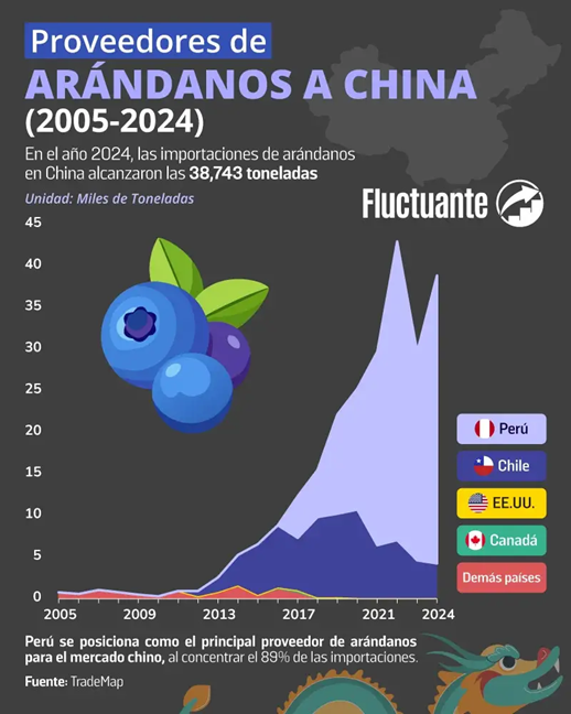 Hace apenas dos décadas, el comercio de arándanos en China era marginal. En 2005, el país importaba apenas 665 toneladas desde solo dos orígenes: Suecia y Corea del Sur. No obstante, este escenario cambió drásticamente con el paso de los años.