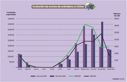 El arándano, por ejemplo, que fue el principal producto exportado por el Perú a China, con más de 14 967 toneladas por un valor aproximado de US$ 107 millones, tuvo una caída de alrededor del 10% en volumen y del 18% en valor en el 2024, siendo uno de los pocos mercados en los que el precio se redujo de manera significativa, -9%.