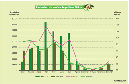 En el caso de la palta, que fue el segundo producto más importante de la canasta agroexportadora peruana a China, la caída en volumen fue de 33 % y la caída en valor fue de 19 %. Pero en este caso, los números negativos no se originaron por mayor competencia. Chile es el principal competidor del Perú en palta en China, pero cada vez cuenta con menos volumen para exportar, mientras que la producción interna de China no fue capaz de abastecer la demanda y esto abrió una ventana para el Perú. Pero la necesidad de certificaciones de áreas libres de polilla del fruto del palto demora hasta dos veces más que las de otras regiones, así que en lugar de entrar más producto peruano, la escasez se traslado a precio, que se incrementó en 21%.