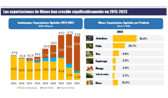 En 2024, la exportación agrícola registrada como consecuencia del Proyecto Olmos representa el 90% del total de agroexportaciones registradas en Lambayeque, donde superó los US$ 1.000 millones. El arándano lideró las exportaciones, seguido por la palta y la uva como los productos más exportados.