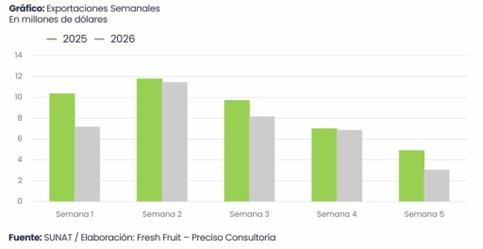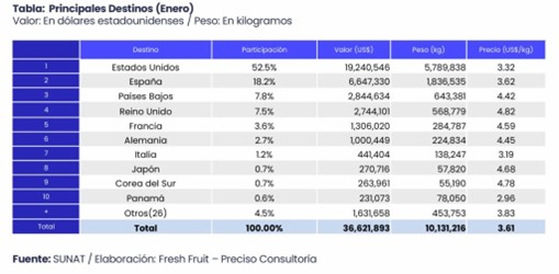 Asimismo, el precio promedio, en el primer mes del presente año, se ubicó en torno a US$ 3.61 por kilogramo, reflejando también una caída respecto a enero de 2025.
