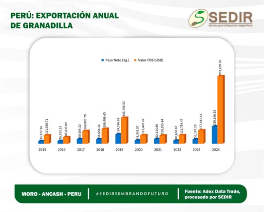 De acuerdo con datos del ADEX Data Trade, procesados por el Servicio para el Desarrollo Integral Rural (Sedir), el desempeño de las exportaciones de granadilla en los últimos cinco años muestra una evolución variable, pero con una tendencia positiva.
