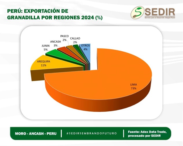 También contribuyeron las regiones como Áncash (7282 kg por $24 958.76), Pasco (5278.80 kg por US$23 237.95 dólares) y Lambayeque (3670 kg por US$20 673). En menor escala, participaron La Libertad, Callao, Ica y Piura, consolidando la presencia de la granadilla en diversas partes del país.
