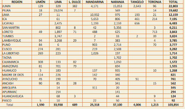 Hectáreas de cítricos en Perú por regiones 2025 (has)