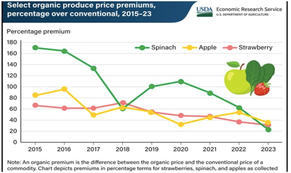 Esta tendencia se pone de relieve en un gráfico del informe del USDA titulado "Economic Research Service's Organic Situation Report", publicado en febrero de 2025. Se puede encontrar información adicional en el artículo de Amber Waves, "Rising Consumer Demand Reshapes Landscape for U.S. Organic Farmers", publicado en noviembre de 2023.