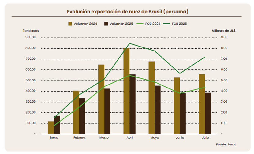 Entre enero y julio del 2025, los envíos peruanos de nuez de Brasil alcanzaron cerca de 2.713 toneladas por un valor de US$ 39 millones, lo que representa una caída de -28% en volumen, pero con un aumento cercano a +50% en valor. La explicación radica en un fuerte incremento de precios internacionales (+107%), impulsado por la escasez de producto tanto en Perú como en Bolivia.