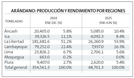El arándano es una fruta que se produce por estaciones y que tiene a La Libertad como la región con más producción. Casi el 90% de lo que se cosecha se va al exterior, según explicó el especialista de Comercio Internacional del Ministerio de Desarrollo Agrario (Midagri) César Romero.