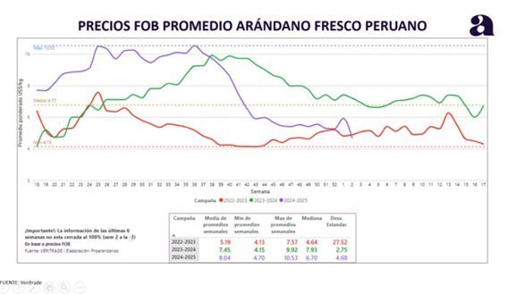 (Agraria.pe) Uno de los grandes retos a futuro para la industria de arándanos peruana es sostener el precio por kilogramo (y por qué no aumentarlo) ante el inminente crecimiento en la oferta exportable que genera naturalmente una presión sobre los precios para el productor y exportador.