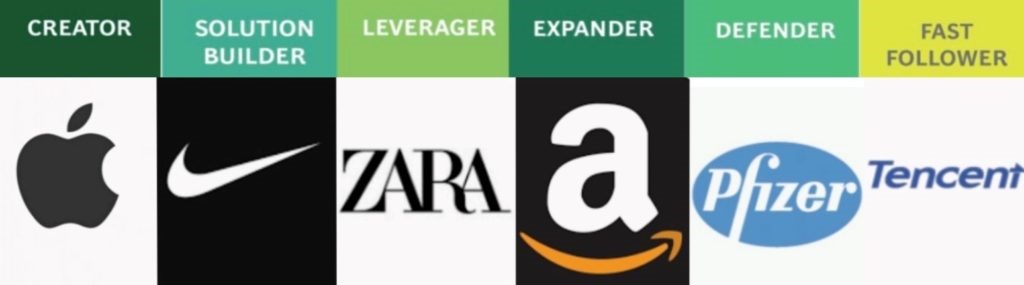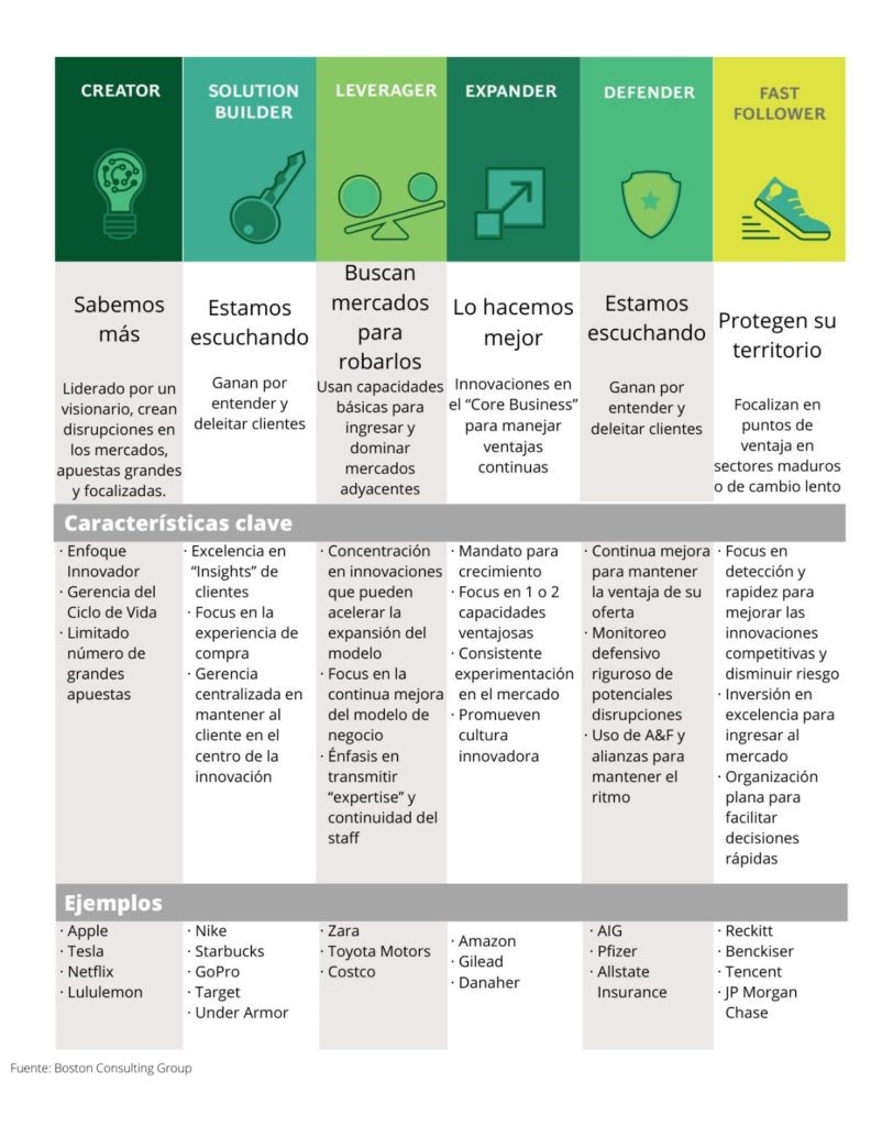 La consultora propone seis modelos de innovación (ver cuadro) de los cuales las cinco primeras opciones (Creadores, Constructores de Soluciones, Apalancadores, Expansivos y Defensivos) vendrían a ser una variedad de First Mover y la última la versión de Fast Follower (