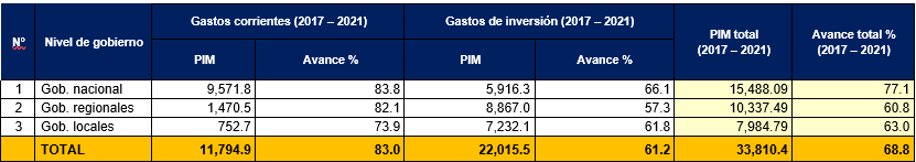 Tabla N° 01. Ejecución presupuestaria de la función agropecuaria 2017-2021 por niveles de gobierno (en millones de soles)