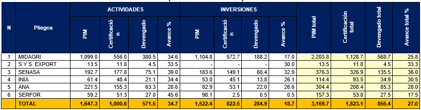 Tabla N° 02. Presupuesto analítico de Midagri por actividades e inversiones (en millones de soles)
