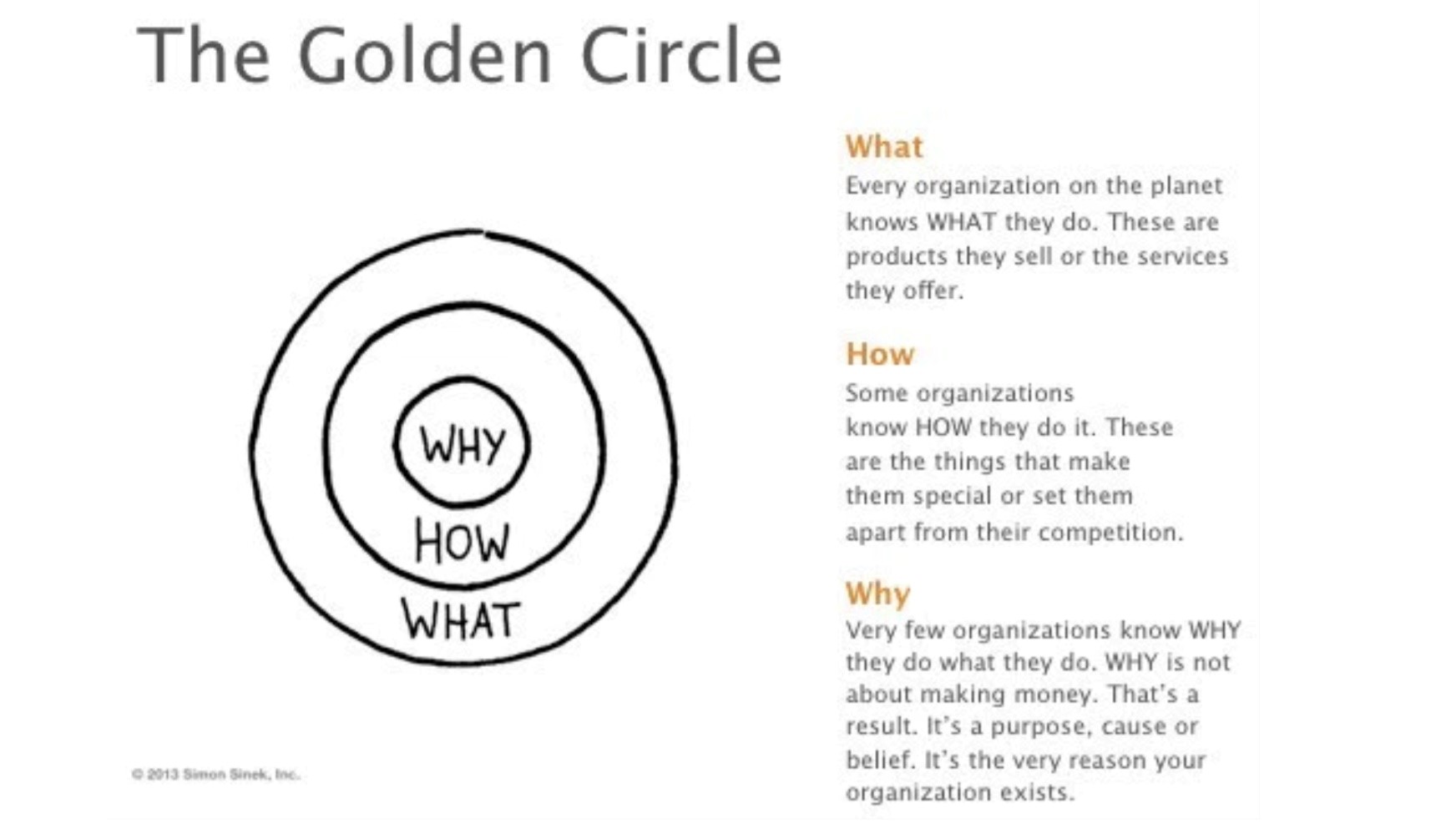 Los clientes no compran lo que haces (what: productos y servicios), ni como lo haces (How: que tan diferentes son) compran la razón (why) por la que los haces. Es decir, se identifican emocionalmente con esa razón y te compran.