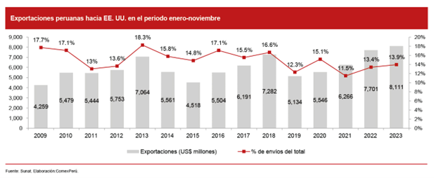 Entre enero y noviembre de 2023, las exportaciones peruanas hacia Estados Unidos sumaron US$ 8.111 millones, representando un incremento de +13.9% en comparación a los US$ 7.701 millones registrados entre enero y noviembre de 2022.