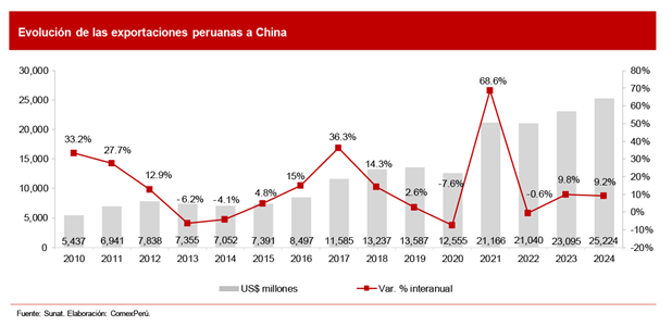 Agregó que los minerales de cobre y sus concentrados lideraron la lista de los principales productos exportados al gigante asiático con US$ 15.692 millones en 2024. Este insumo es requerido para el desarrollo de industrias chinas como la fabricación de autos eléctricos, sistemas de energía renovable y cableado de edificaciones, entre otros.