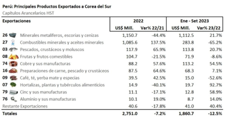 (Agraria.pe) Entre enero y septiembre de 2023, las exportaciones peruanas (tradicionales + no tradicionales) a Corea del Sur sumaron US$ 1.861 millones, mostrando una caída de -12.5% frente a los US$ 2.126 millones alcanzados en igual periodo del año anterior.