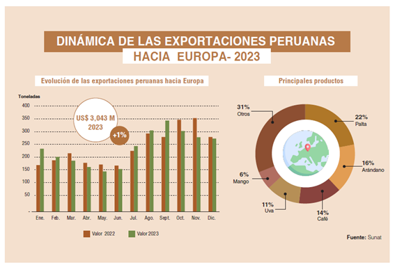 En el 2023, la palta tomo el primer lugar como principal producto exportado por el Perú, desplazando al café. La palta sumó 401.000 toneladas exportadas hacia el viejo continente por un valor aproximado de US$ 660 millones. Esto significó un crecimiento de 12% en volumen y 23% en valor. Con respecto al precio, este se posicionó en un promedio de US$ 1.65 por kilogramo (10% mayor a lo recibido el año pasado). Uno de los principales factores de este crecimiento es el dominio de la palta mexicana en los Estados Unidos, hecho que produjo el redireccionamiento de la palta peruana hacia destinos con mejores precios y mayores espacios comerciales. El principal país de entrada de este producto fue los Países Bajos, con casi 50% de participación, seguido por España con 30% de participación y el Reino Unido con 14% de participación.