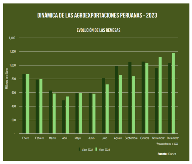 Durante el primer trimestre del 2023, la situación imperante se presentó en los conflictos sociales que limitaron el transporte y procesamiento de los productos agrícolas. Además, las precipitaciones que azotaron la costa norte encontraron su pico en estos meses. A pesar de ello, las remesas no presentaron una gran caída ya que las consecuencias de estas desfavorables situaciones se iban a sentir más adelante. Con ello, las remesas totalizaron cerca de US$ 2.255 millones, 2% menor al año anterior.