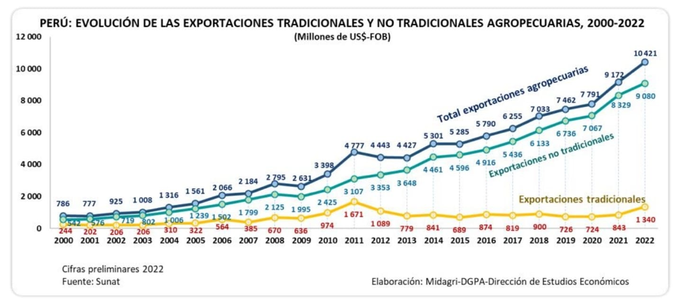 Respecto al comportamiento de las exportaciones agropecuarias y/o agroindustriales (no tradicionales), estas son muy dinámicas y muestran elevadas tasas de crecimiento, con un 13.7% promedio anual entre los años 2000 al 2022 al pasar de US$ 542 millones a US$ 9.080 millones. Sin embargo, registra un aumento anual de 11.6% entre los años del 2010 al 2022 al pasar de US$ 3.107 millones a US$ 9.080 millones.