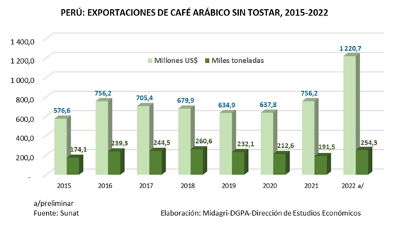 Cabe señalar que, en los últimos años, el café arábico sin tostar representa casi el 90% en promedio de las exportaciones tradicionales. En el 2022, las exportaciones se elevaron a un valor de US$ 1.221 millones, es decir, un 61.4% por encima de las exportaciones del año 2021 (US$ 756 millones), lo cual se debe al buen precio pagado en el mercado internacional.