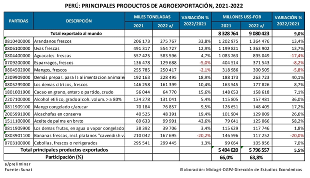 Las quince principales subpartidas arancelarias que muestran a los productos exportados en los últimos dos años (arándanos frescos, uvas frescas, paltas frescas, espárragos frescos, mangos frescos, preparados para la alimentación de animales, cítricos frescos, cacao en grano, alcohol etílico mayor a 80°, mango congelado, alcachofa en conserva, aceite de palma en bruto, las demás frutas congeladas, bananas frescas y cebollas frescas) representan en conjunto el 65% del total exportado y un aumento de su valor de 5.5% en el 2022 respecto al año anterior.