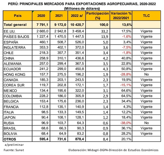 No cabe duda de que esta disminución de las exportaciones hacia Europa se explica por los diversos problemas logísticos, comerciales y económicos que viene atravesando dicha región, como consecuencia de la guerra entre Rusia y Ucrania. Anteriormente, la Unión Europea participaba hasta con un 36% del total exportado; sin embargo, se espera que esta situación se regularice en los próximos meses del año. Por otra parte, cabe mencionar que Inglaterra era miembro de la Unión Europea, pero al separarse del bloque europeo, el Perú ha tenido que suscribir un nuevo tratado comercial con dicho país para mantener las mismas condiciones comerciales acordadas con la Unión Europea a la suscripción del acuerdo el 26 de junio de 2012.