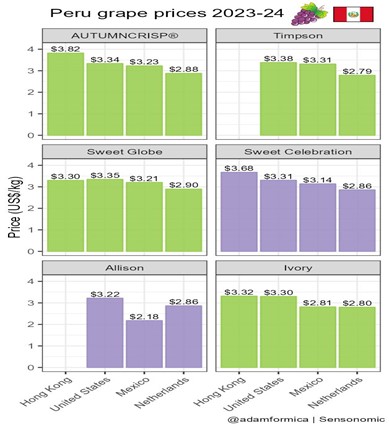 (Agraria.pe) Los precios de la uva de mesa peruana han variado según el país de destino y la variedad despachada en la campaña 2023-2024. Según señala Adam Formica, director científico de la empresa de tecnología agrícola Sensonomic, de las seis principales variedades nuevas, AUTUMNCRISP®, Timpson y Sweet Globe son las de mayor costo. En los cuatro mayores mercados, Hong Kong es el que típicamente ha pagado más, seguido por Estados Unidos, México y Países Bajos.