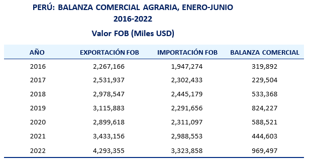 Asimismo, la balanza comercial agraria en el primer semestre del año registró un superávit de US$ 969.494.000 (US$ 4.293.355.000 de las exportaciones, menos US$ 3.323.858.000 de las importaciones), cifra mayor en 118% en comparación con los US$ 444.603 registrado en el mismo periodo del año pasado. Dicho aumento obedeció a las mayores colocaciones en dólares de las exportaciones agrarias (US$ 860 millones de aumento respecto al 2021).