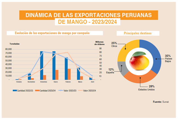La última campaña 2023/2024 lamentablemente mostró un desempeño extremadamente bajo debido a las altas temperaturas, las terribles lluvias y la poca floración en los campos de mango. La campaña se presentó bastante retrasada en comparación a la anterior con 84.632 toneladas exportadas por un valor de US$ 239 millones, registrando una reducción de -68% en volumen y -21% en valor frente a lo registrado en la campaña 2022/2023. Esta menor contracción en el valor se explica a la mejora en los precios (+149% para un precio promedio de US$ 2.82 por kilogramo) producto del desabastecimiento.