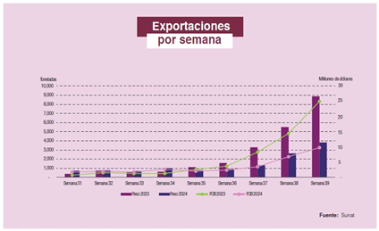 En la actual campaña 2024/2025, el clima parece haberse estabilizado, y los envíos han comenzado a un ritmo más habitual. Hasta finales de septiembre, los despachos totalizaron 13.444 toneladas con un valor de US$ 35 millones, lo que representó una disminución de -45% en volumen y -44% en valor comparado al mismo periodo anterior. Piura representó el 76% de estas remesas, seguido por Arequipa y Lambayeque, con un 11% cada uno. Esta distribución podría cambiar cuando inicie la temporada en Ica, que suele ocupar el primer lugar.