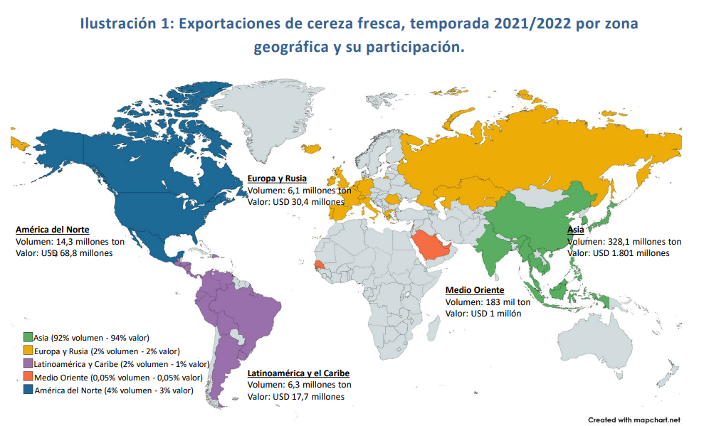 El mercado asiático en general, desde hace algunos años, se ha considerado relevante. El resultado de la temporada de cerezas en comparación con la anterior, se observa un crecimiento de 30% en volumen y 13% en valor. Destacan también el crecimiento de los envíos a Corea del Sur, con 28% y Vietnam con 130%, ambos en volumen. Para este último país fue su segunda temporada desde la