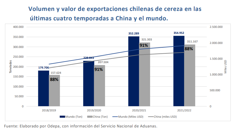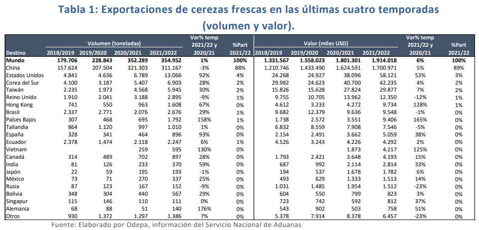 Según el Servicio Nacional de Aduanas, Chile incrementó sus exportaciones de cerezas 1% en volumen y 6% en valor comparado con la temporada anterior, alcanzado un total de 354.952 toneladas y US$ 1.914 millones exportados. El 88% del volumen fue destinado a la República Popular China, 3% menos que la temporada anterior, debido a situaciones complejas en los puertos por procedimientos de desaduanaje, esto dificultó la reposición de los stocks de fruta disponible en los centros de comercialización (mayoristas y retail), los estrictos confinamientos chinos hicieron más lento el trabajo en los puertos, lo mismo generaron los intensos análisis de virus Covid-19 y de vegetales, los cuales por temas de tiempo en algunos casos perjudicaron la condición de la fruta y los precios de venta.