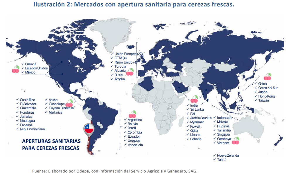 Un dato importante para los productores, es que el Ministerio de Agricultura, por medio del Servicio Agrícola y Ganadero (SAG) y las Agregadurías Agrícolas, realizan negociaciones de aperturas sanitarias y ya Chile cuenta con 84 mercados con apertura sanitaria disponible para cerezas frescas.