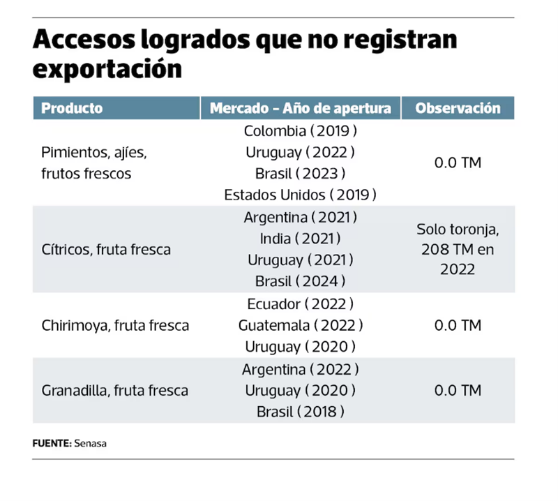 Nely Wilcas Márquez, directora de la Subdirección de Cuarentena Vegetal del Senasa, precisó que algunos de estos productos agrícolas son los ajíes y pimientos, los cítricos, la chirimoya y la granadilla. Si bien estos frutos se exportan a varios mercados, hay otros países en los que no se están explotando los permisos fitosanitarios concretados.