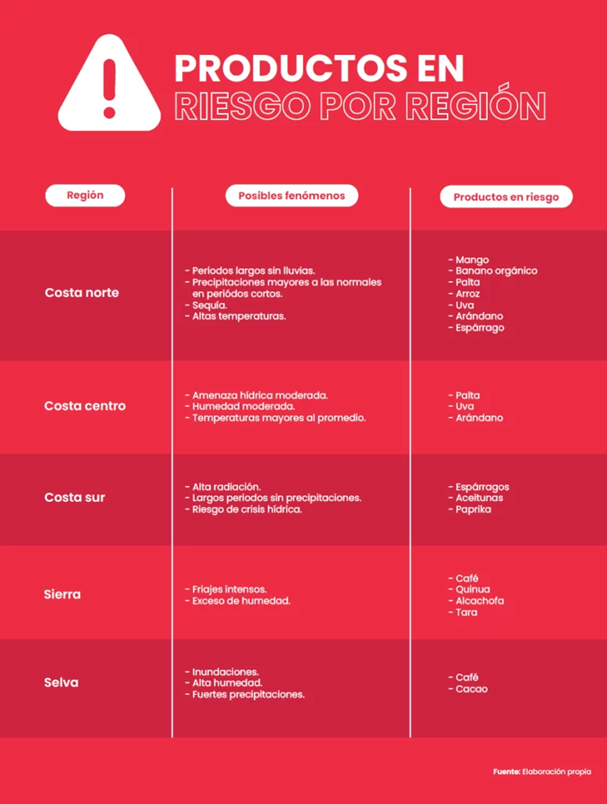 Además de la amenaza del fenómeno El Niño, se proyecta que tanto este año como el siguiente se incrementará la incidencia de olas de calor, friajes intensos y lluvias de mayor intensidad de lo habitual, lo que afectará la productividad agrícola a nivel nacional. Estos fenómenos climatológicos condicionan el comportamiento de los cultivos y repercuten directamente en la rentabilidad de los productores. Por ejemplo, las olas de calor influyen notablemente en los ciclos de crecimiento; la reciente crisis de sobreproducción de mango y el cruce de campañas se debió, en parte, a que las altas temperaturas aceleraron la caída de los frutos y aumentaron la demanda de agua, coincidiendo con la crisis hídrica en regiones productoras. Asimismo, la combinación de lluvias intensas y de corta duración puede propiciar la aparición de plagas al acortar los ciclos de reproducción, amenazando la calidad de los cultivos.