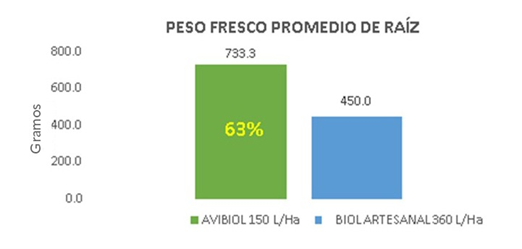 Como resultado se obtuvo un peso promedio de raíces en el tratamiento Avibiol Bioefector de 733.3 gr, mientras que el tratamiento con biol artesanal pesó 450.0 gr., teniendo así un aumento del 63% a favor de Avibiol Bioefector. También, se observó la recuperación del cultivo en zonas críticas gracias al poder efectivo de Avibiol Bioefector.