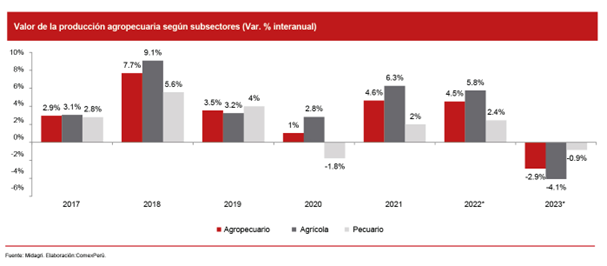 En cuanto al análisis por producto, de acuerdo con cifras del Midagri, la disminución en la producción de arándanos (-22.5%), en La Libertad y Lambayeque, y de mango (-23.1%), en Piura y Áncash, generada por el anormal aumento de las temperaturas, afectaron el sector. Asimismo, la producción de quinua sufrió una caída del 38.4% en Puno y Cusco, debido a la escasez de recursos hídricos en estos departamentos.