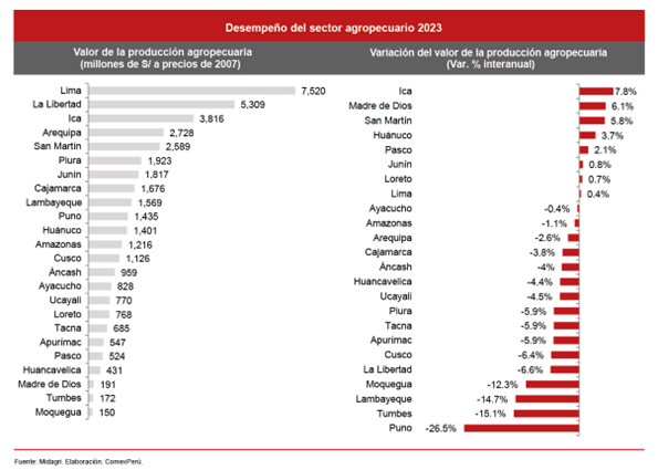 A nivel departamental, Lima encabezó el ranking del valor de la producción agropecuaria en 2023, al registrar S/ 7.520 millones, lo cual es un aumento de +0.4% en comparación con 2022. Luego se ubicó La Libertad, con S/ 5.309 millones (-6.6%), seguido por Ica con S/ 3.816 millones (+7.8%), Arequipa con S/ 2.728 millones (-2,6%), San Martín con S/ 2.589 millones (+5.8%) y Piura con S/ 1.923 millones (-5.9%).