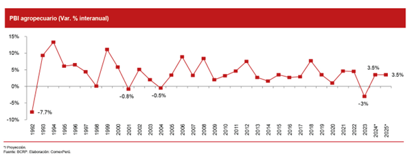 “De esta manera, se evidencia que el sector agropecuario del Perú enfrentó un desafiante año en 2023, debido a los fenómenos climáticos adversos, las tensiones sociales y sanitarias, y la elevada inflación de los últimos años. Aunque se proyecta una leve recuperación para 2024, es necesario mejorar la gestión en proyectos de infraestructura de riego para mitigar los impactos de los fenómenos climáticos y crear condiciones de producción más favorables. Una adecuada infraestructura hídrica no solo fortalece la resiliencia del sector agrícola, sino que también impulsa el desarrollo de una las principales actividades económicas del país y que es el sustento primordial de muchas familias”, finaliza Comex Perú.