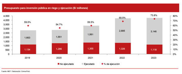 Para la Sociedad de Comercio Exterior del Perú (Comex Perú), si bien la respuesta resulta repetitiva, la inversión pública en proyectos de irrigación es la mejor herramienta. Al respecto, dijo que en el 2023, se asignaron S/ 6.081 millones al sector agropecuario, de los cuales S/ 4.264 millones fueron destinados a proyectos de irrigación. Sin embargo, se dejaron de ejecutar S/ 1.118 millones de este presupuesto.