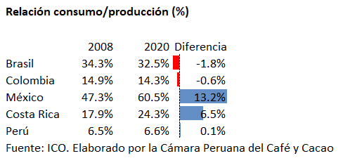 El análisis del consumo debe realizarse de manera individual, por lo que la ICO propone el índice de consumo/producción como una medida de comparación. Para el año 2008, el índice peruano fue de 6.5%, mientras que en el año 2020 fue de 6.6%, estático en términos reales y absolutos. En este mismo periodo México y Costa Rica incrementaron el indicador a 60.5% y 24.3% respectivamente. Adicionalmente, los indicadores de Brasil y Colombia disminuyeron levemente, pero esto debido a que han incrementado su producción; en términos absolutos ambos países consumen mucho más que en el año 2008.