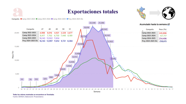 Cabe destacar que la campaña de arándanos de Perú se considera desde mayo de 2024 hasta abril de 2025.
