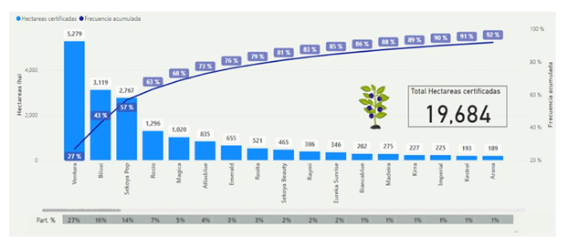 Proarándanos indicó que se observa que el 67% del total de las hectáreas se aglomera en cinco variedades: Ventura de Fallcreek con 26%, Biloxi con 16%, Sekoya Pop de Sekoya con 14%, Rocio de Hortifrut con 8% y por último, Mágica de Ozblu con 5%, las que en su mayoría se encuentran en el norte del país, en el departamento de La Libertad.