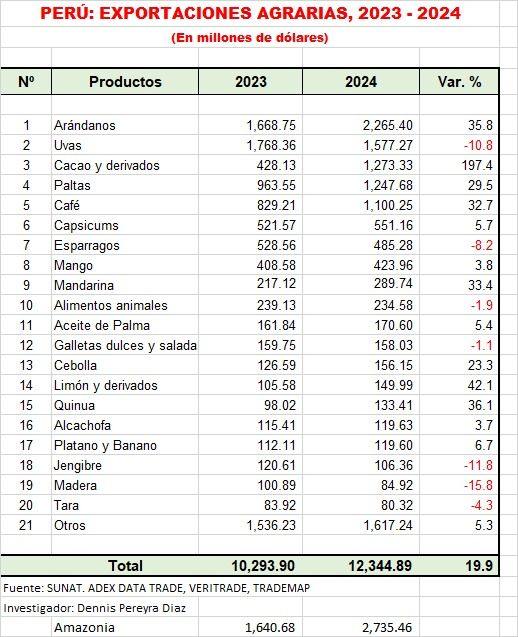 Yturrios Padilla destacó que sumadas las exportaciones de café y cacao en 2024 de Perú superan los despachos al exterior de arándanos en ese año, la gran diferencia es que mientras que el mencionado berrie es producido en grandes plantaciones de la costa que cuentan con tecnología de punta, gerencia de primer nivel y financiamiento, el café y el cacao son dos de las cadenas más inclusivas en nuestro país pues incorporan a más de 300.000 pequeños productores independientes que cultivan en nuestra Amazonía alrededor de 690.000 hectáreas de café y cacao, enfrentando múltiples dificultades vinculadas a la carencia de asistencia técnica, gerencia, tecnología y financiamiento, lo cual hace doblemente importante este logro.