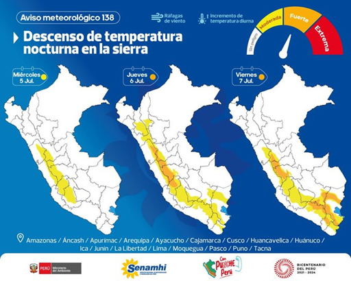De acuerdo con el comunicado del Servicio Nacional de Meteorología e Hidrología (Senamhi), de nivel naranja, se prevén temperaturas de alrededor de 1 grado bajo cero en la sierra norte y próximos a los 9 grados bajo cero en la sierra centro.