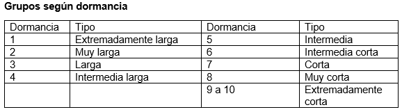 Según los grupos de Dormancia, existen entre el 1 al 10, incluso se habla de Dormancia 11. En el Perú predomina el uso de variedades de dormancia 3, 4 hasta dormancia 10. Las variedades que pertenecen a los Grupos 3 y 4, tienen periodos de Dormancia Larga e Intermedia Larga, respectivamente. Y las variedades de Dormancia de 9 a 10 tienen periodos de dormancia extremadamente cortos. Un buen indicativo, es que suele coincidir el grupo de dormancia con la cantidad de Cortes por año, lo que quiere decir que una alfalfa con dormancia 10 podría darnos alrededor de 10 cortes por año. Mientras una alfalfa con dormancia 4, podría darnos entre 4 a 5 cosechas durante el año.