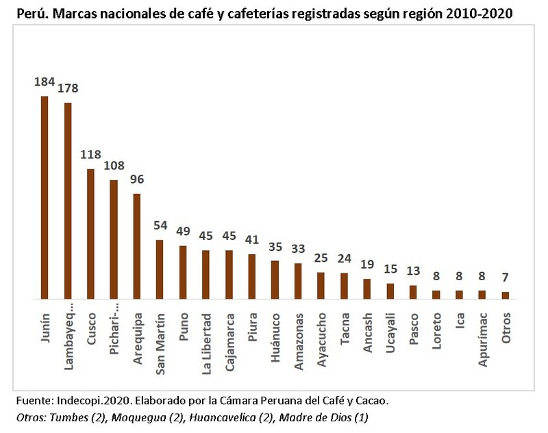 Fuera de Lima, en el periodo 2010-2020, se registra un mayor número de marcas nacionales de cafeterías y café en las provincias de Junín (184), Lambayeque (178), Cusco (118), Pichari-Vraem (108), Arequipa (96), San Martín (54), Puno (49), La Libertad (45), Cajamarca (45), y Piura (41). Precisamente las provincias productoras de café. En el caso de Lambayeque, hay una relación con su consolidación como proveedor de café regional en la costa norte.