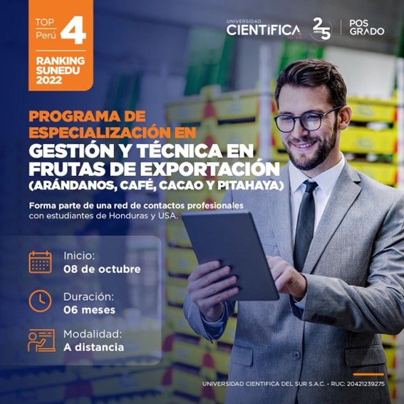 (Agraria.pe) La carrera de Agronomía y Negocios de la Universidad Científica del Sur, anunció el lanzamiento de un programa de especialización innovador y de alto nivel académico: Gestión y Técnica en Frutas de Exportación, enfocado en cultivos de alto valor como el arándano, pitahaya, café y cacao. Este innovador programa, diseñado para transformar el futuro del agro, cuenta con la colaboración exclusiva de la prestigiosa Universidad Zamorano de Honduras y Estados Unidos, lo que lo posiciona como una opción de formación de élite para los profesionales del sector. Este programa se dictará en simultaneo en Perú, Honduras y EEUU, lo que permitirá a los participantes obtener un networking de alto valor con profesionales de estos países, además de Guatemala, El Salvador, Panamá y Ecuador.